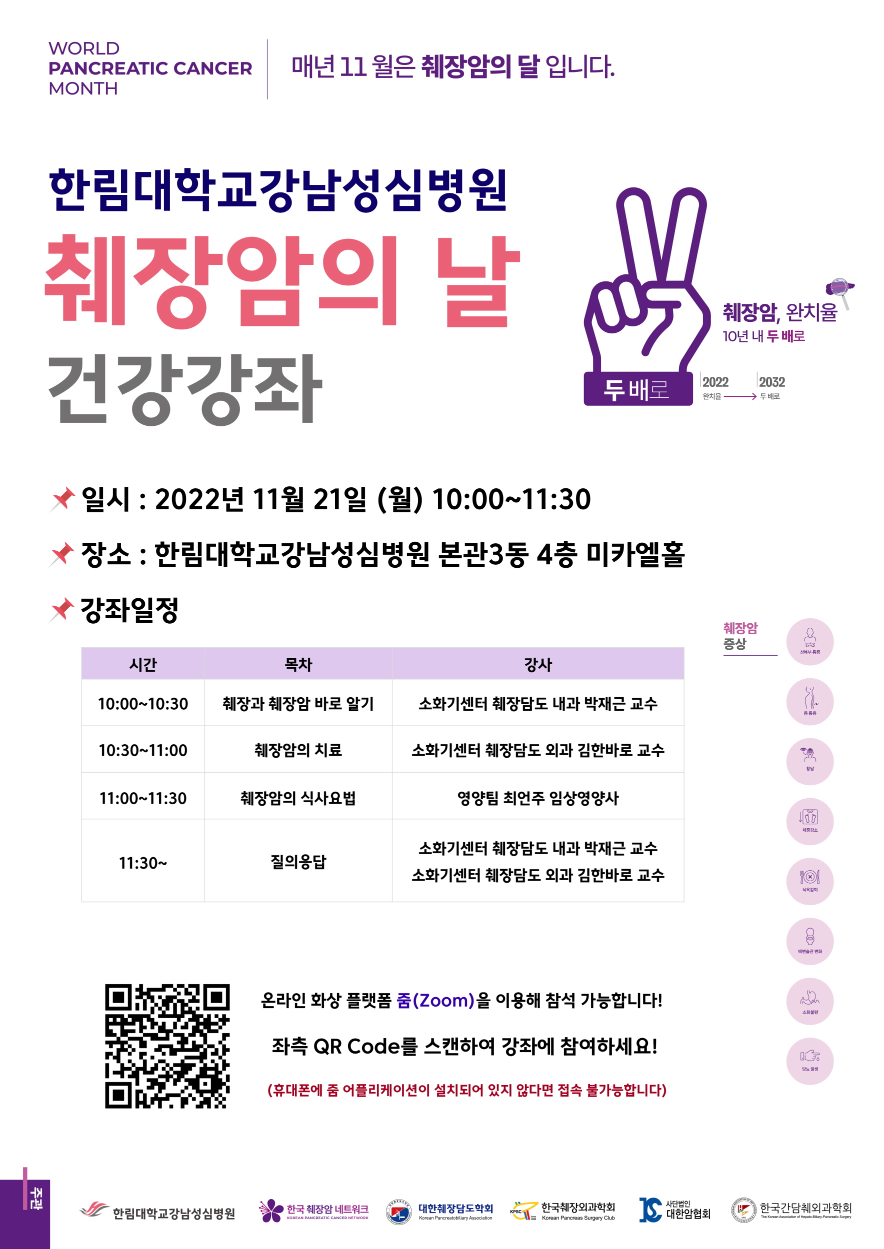 ÇѸ²´ëÇб³°­³²¼º½Éº´¿ø(º´¿øÀå ÀÌ¿µ±¸)Àº 11¿ù 21(¿ù) ¿ÀÀü 10½ÃºÎÅÍ 12½Ã±îÁö º»°ü3µ¿ 4Ãþ ¹ÌÄ«¿¤È¦¿¡¼­ ¡®ÃéÀå¾ÏÀÇ ³¯ °Ç°­°­Á¡¯¸¦ °³ÃÖÇÑ´Ù. ¾Æ¿ï·¯ ÁÜ(Zoom)À» ÅëÇØ ¿Â¶óÀÎÀ¸·Î Âü°¡ÇÒ ¼ö ÀÖ´Ù.