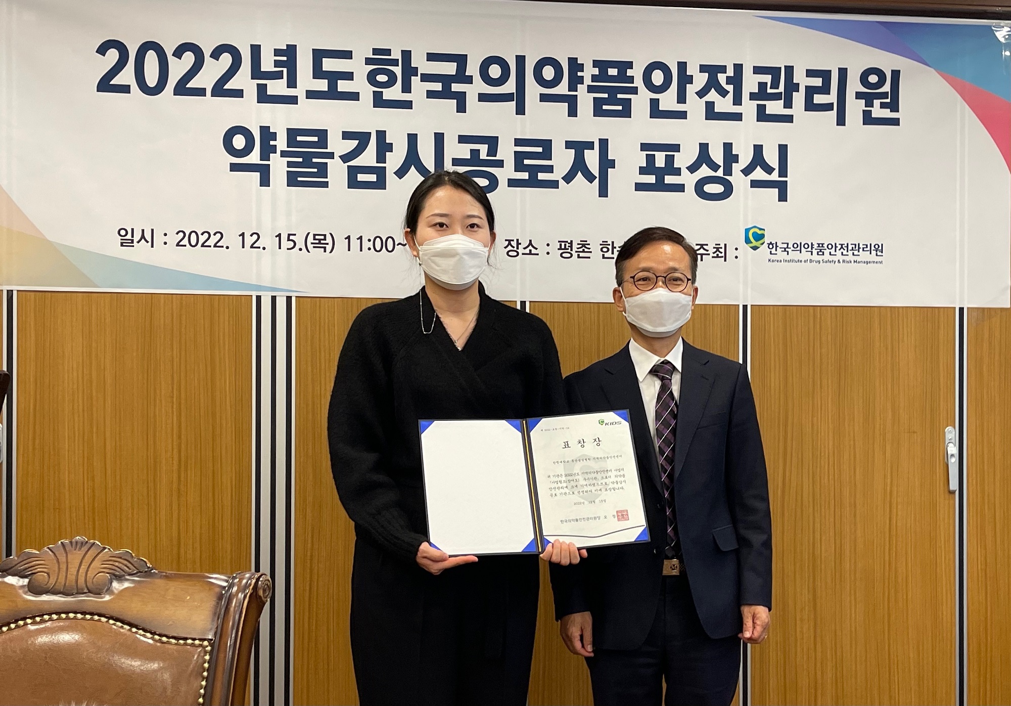 ÇѸ²´ëÇб³µ¿Åº¼º½Éº´¿ø Áö¿ªÀǾàǰ¾ÈÀü¼¾ÅÍ(¼¾ÅÍÀå ÃÖÁ¤Èñ)°¡ Áö³­´Þ Çѱ¹ÀǾàǰ¾ÈÀü°ü¸®¿ø(¿øÀå ¿ÀÁ¤¿Ï)¿¡¼­ ÁÖÃÖÇÑ ¡®¾à¹°°¨½Ã °ø·Î Æ÷»ó½Ä¡¯¿¡¼­ »ç¾÷ÇùÁ¶ ºÎ¹® ¿ì¼ö±â°üÀ¸·Î ¼±Á¤µÅ °ø·Î»óÀ» ¼ö»óÇß´Ù.