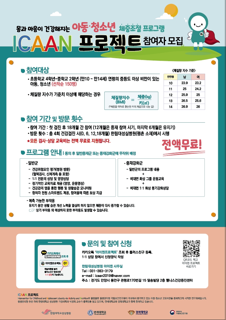 ÇѸ²´ë¼º½Éº´¿øÀÌ ÁßÁõµµ ÀÌ»óÀÇ ºñ¸¸ ¾Æµ¿¡¤Ã»¼Ò³âÀ» ´ë»ó ºñ¸¸°ü¸® ÇÁ·Î±×·¥ÀÎ ¾ÆÀÌĵ(ICAAN: Intervention for Childhood and Adolescent obesity via Activity and Nutrition)ÀÇ Âü°¡ÀÚ¸¦ 7¿ù 31ÀϱîÁö ¸ðÁýÇÑ´Ù.
