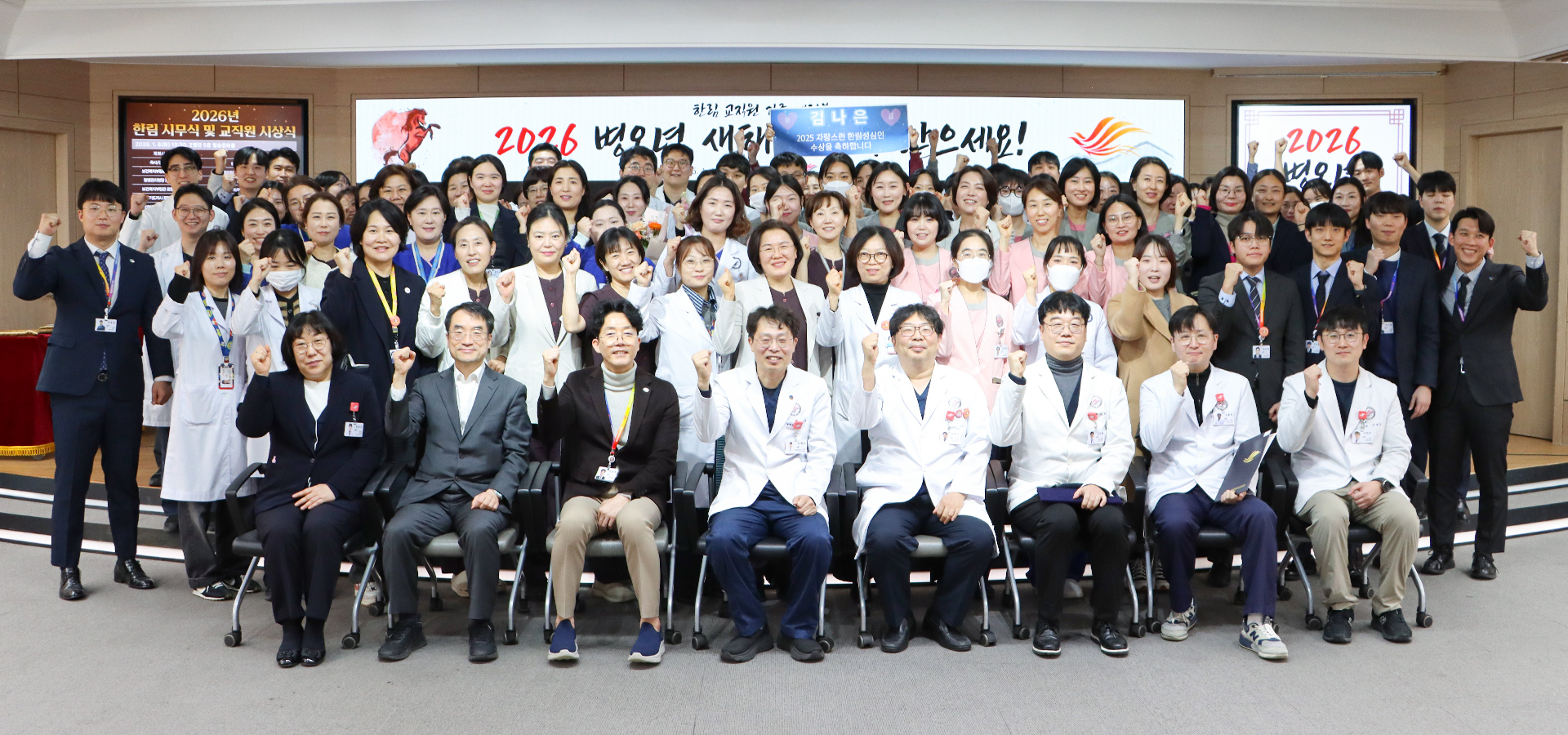 <»çÁø ¼³¸í : ¡®2026³â ÇѸ² ½Ã¹«½Ä ¹× ±³Á÷¿ø ½Ã»ó½Ä¡¯¿¡¼­ ±èÇü¼ö º´¿øÀå(¾ÕÁÙ ¿ÞÂÊ¿¡¼­ 4¹øÂ°)°ú ÁÖ¿ä º¸Á÷ÀÚ, ¼ö»óÀÚ¸¦ Æ÷ÇÔÇÑ ±³Á÷¿øÀÌ ±â³ä ÃÔ¿µÀ» Çϰí ÀÖ´Ù.>